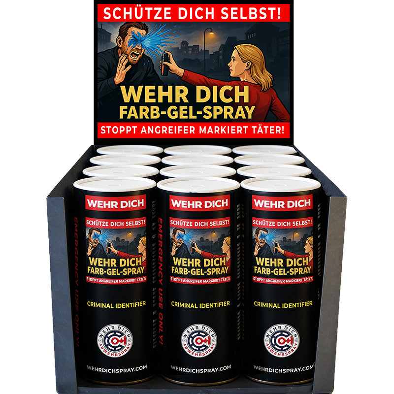 Das WDS WEHRDICHSPRAY Farb-Gel-Spray ist Reizstoff-frei und versprüht eine stark haftende, blaue Lebensmittelfarbe, welche Angreifer abschreckt und auch noch längere Zeit nach der Tat eine sichere Identifizierung des Täters ermöglicht.