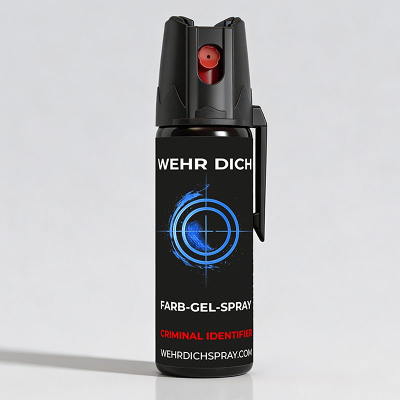 Das WDS WEHRDICHSPRAY Farb-Gel-Spray ist Reizstoff-frei und versprüht eine stark haftende, blaue Lebensmittelfarbe, welche Angreifer abschreckt und auch noch längere Zeit nach der Tat eine sichere Identifizierung des Täters ermöglicht.
